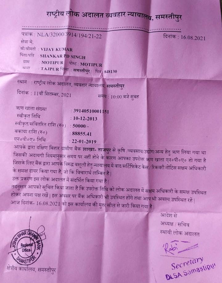 उत्तर बिहार ग्रामीण बैंक सहित अन्य बैंकों द्वारा किसानों को लोन अदायगी के लिए धराधर नोटिस भेजा जा रहा है। इसमें बैंक द्वारा वसूली हेतु न्यायालय में वाद/सर्टिफिकेट केस//रिकवरी नोटिस सक्षम अधिकारी के समक्ष दायर किया गया है जहां 11 सितंबर 2021 को उपस्थित होने को कहा गया है। परिस्थिति के मारे बेहाल किसान को कुछ समझ में ही नहीं आ रहा है, क्या करें और क्या न करें।