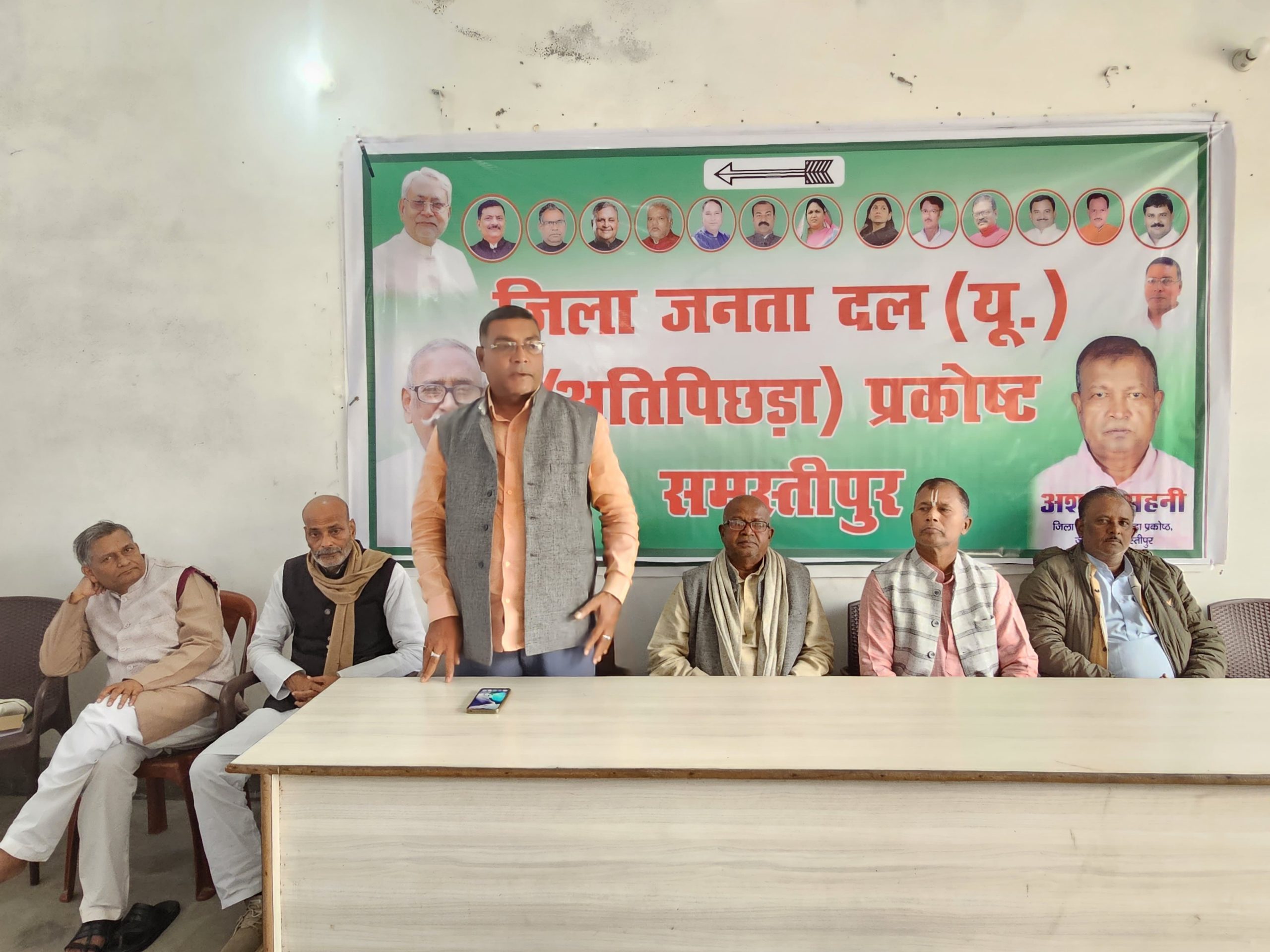 समस्तीपुर: जदयू अति पिछड़ा प्रकोष्ठ का 1 दिसंबर को आहुत जिला स्तरीय कार्यकर्ता सम्मेलन जो कर्पूरी सभागार बारह पत्थर में आयोजित है इस कार्यक्रम को सफल बनाने हेतु जदयू अति पिछड़ा प्रकोष्ठ समस्तीपुर का समीक्षात्मक बैठक लोहिया आश्रम में आयोजित किया गया। इस अवसर जद यू जिला अध्यक्ष सह जिला बीस सुत्री उपाध्यक्ष डॉ दुर्गेश राय ने कहा कि मुख्यमंत्री नीतीश कुमार के नेतृत्व में बिहार में अति पिछड़ा समाज को सामाजिक, राजनीतिक उत्थान मिला पंचायती राज, नगर निकाय, में आरक्षण, विद्यालयों छात्रों को पोशाक व छात्रवृत्ति, सरकारी नौकरीयों में आरक्षण देकर अति पिछड़ा समाज को नई उंचाई दिया।ओर साथ ही कहा की जद यू समस्तीपुर जिला कार्यकर्ता सम्मेलन में जदयू के कार्यकारी अध्यक्ष संजय झा के नेतृत्व में मंत्री मदन सहनी, मंत्री जमा खान, सांसद लवली आनंद, विधायक रामविलास कामत, पूर्व मंत्री संतोष निराला, पुर्व विधायक रमेश सिंह कुशवाहा, पुर्व विधायक मनीष चौधरी, पुर्व विधायक वशिष्ठ सिंह पधार रहे हैं। इस बैठक की अध्यक्षता जदयू अति पिछड़ा प्रकोष्ठ जिला अध्यक्ष अशरफी सहनी ने किया।इस बैठक में अशोक कुमार पप्पू,सूरज सहनी,विष्णुदेव सहनी, जगरनाथ ठाकुर, रविन्द्र ठाकुर, रज़ा अहमद अरुण कुमार मुखिया,राम नगीना सहनी ,बनारसी ठाकुर, मानतूं सहनी,अयोध्या पंडित,राजकुमार ठाकुर,राजकुमार महतो,गौरव शर्मा,सच्चिदानंद शर्मा,कामेश्वर दास,परीक्षण कुमार महतो,संजीत कुमार सहनी,राजकुमार सहनी,दिनेश सहनी,रामप्रीत सहनी,अशोक कुमार मंडल,दीपक भगत आदि साथी शामिल हुए।